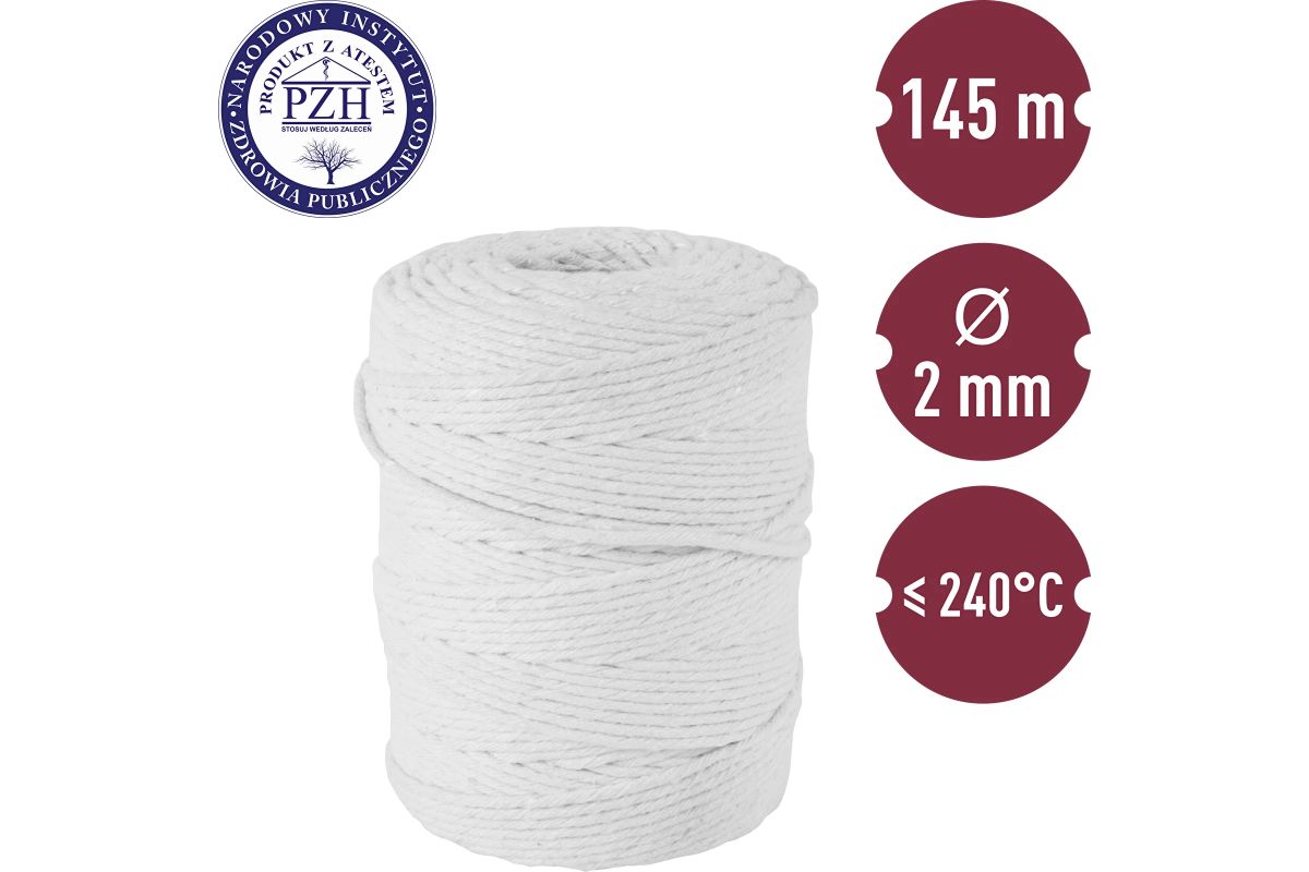 Biele bavlnené nite na klobásy – na ručné viazanie mäsa určeného na nakladanie, údenie, dusenie alebo na rolády počas pečenia. Prírodné materiály umožňujú tepelné spracovanie mäsa (až do 240 °C) bez zmeny jeho arómy alebo chuti. Nite sú mimoriadne odolné, čo umožňuje zavesiť mäso na háčik bez obáv z pádu.